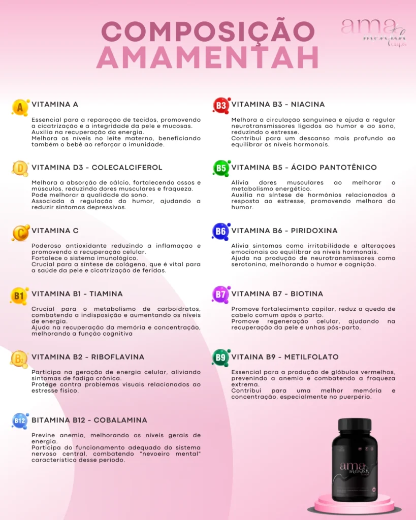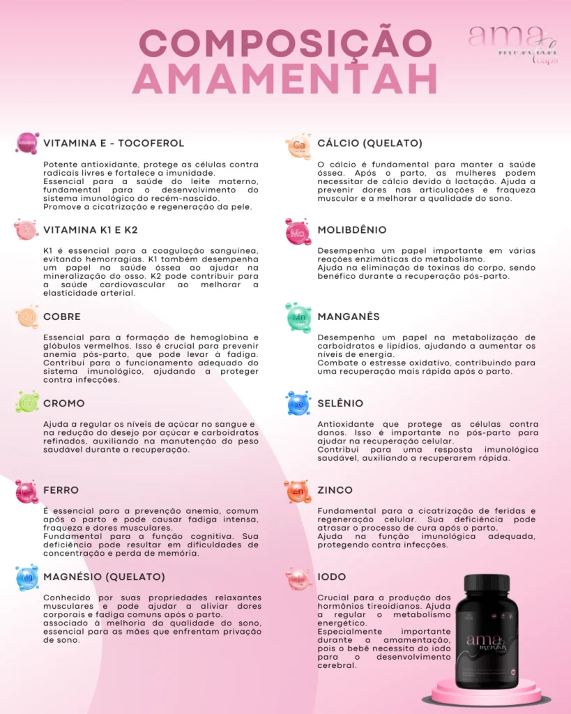 Com certeza! O puerpério é um período desafiador, no qual o corpo precisa se recuperar do parto, equilibrar os hormônios e produzir leite para alimentar o bebê. O Amamentah Caps é um suplemento vitamínico projetado para apoiar a recuperação pós-parto e a saúde da mãe, inclusive durante a amamentação. Este produto contém uma combinação abrangente de vitaminas e minerais, essenciais para o bem-estar materno. Com vitaminas do complexo B, A, C, D, E, K e minerais como ferro, zinco e cálcio, o Amamentah Caps ajuda a restaurar a energia da mãe, prevenir anemia e fortalecer o sistema imunológico. Esses nutrientes são fundamentais para a saúde da mãe e do bebê.